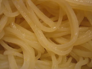 ゆず切りは変わりそばのひとつで、蕎麦の実の中心部分から取った更級粉にゆずを混ぜて打ったものです。