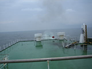 7:38 夜が明けると フェリーは太平洋のど真ん中。 陸地はおろか、辺りに船さえも見えません。 (この時間、フェリーは三重県沖を航行中です) |