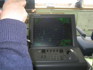 15:21 レダーです。 いわゆる、”船の目”ですね。 カーナビと違って、ヘッドアップしません。上が北です。 船は現在、左下(南西)に向かって進んでいます。 現在の画面設定は1目盛り=5マイル (1マイル(海里)=1.852キロメートルだそうじゃ) |
