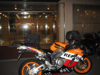 22:42 ”プチおさ1号”号? バイクの駐輪場には1台のGSX−Rが。 すでに到着済のプチおさ1号さんの愛車、GSX−Rでしょう。きっと。 とりあえず、写真に納める。 |