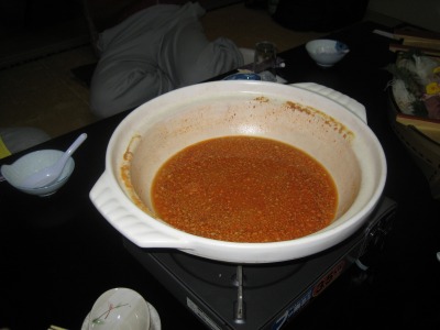 19:15 鍋ができました アンコウ鍋が出来上がりました。 いやいや、写真写りが悪いですね。 流石、”どぶ汁”美味しそうに見えませんが、これが旨いんだな。 味は濃厚、かと言って白身の魚、決して脂っこくはありません。 ボリューム感があって、『食べたぁ〜』って感じがあります。 |