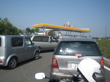 8:32 牧ノ原サービスエリアはガソリン渋滞 走れども走れども、渋滞。 渋滞から抜け出すため、渋滞の先頭を目指してすり抜けを続けますが、渋滞がどんどん先へ先へと延びて行きます。 結局、静岡の先、焼津付近まで渋滞で、ずーーーーっとすり抜け。疲れちゃう! ようやく牧ノ原のサービスエリアに到着です。 牧ノ原まで、約200km。約3時間半かかりました。 高速なのに、平均時速50kmとは。。。 ここで、今日1回目の給油。 ガソリンスタンドも渋滞。 ガソリンスタンドのおじさんも、『今日1日トイレに行く暇もなくガソリンを入れ続けます』と嘆いていました。 |