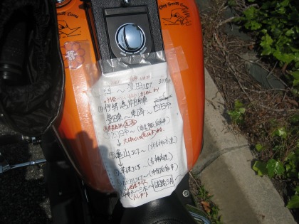 9:55 ナビゲーションシステム こちら、タンクに貼り付けられた、男レーシングさんのナビゲーションシステム。 手書きです。(^o^) しかも、このレポを書いているときに気が付きましたが、各地の美味いものリスト付き。 (写真のところにカーソルを移動すると、よく見えます) |