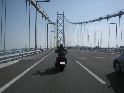 16:29 鳴門の渦潮 眼下の鳴門海峡には名物の渦潮が見えます。 初めて見ましたが、この高さで走っているバイクから流れているのが分かるんだから、すごい流れですね。ビックリ! |