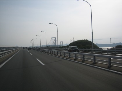 15:29 高いね 橋の長さが4km弱、橋桁と橋桁の間の距離が2km弱。 で、橋桁の高さが300m弱あるそうで、世界一の吊り橋だそうだ。 おかげで、今走っている道路も高い高い。 あまりの高さに、下が海であることの現実感が今ひとつない。 でも景色は最高! |