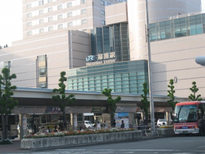 17:14 徳島駅に到着 鳴門インターから国道11号線を南下し、JR徳島駅に到着しました。 特に駅に用事があるわけではありませんが、写真を一枚。 ごくごく最近の様式の建物で、”駅舎”と言った雰囲気がなく、訪問者としては面白味に欠けます。 が、走っているのは”電車”ではなく、ディーゼルエンジンの”汽車”。 |