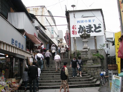 10:40 階段スタート 金比羅さんはなんと言っても、石段が有名。 御本宮までは785段あるそうで、さらにその先に奥社というのがあって、そこまで行くと1300段を越えるそうです。 普通の人は、御本宮まで登ってお参りするのが一般的らしい。 さっそく、登ってみるとしますか。 |