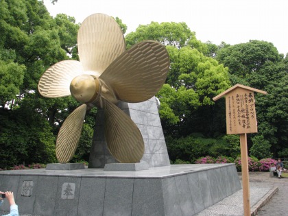 10:54 奉納プロペラ 階段の途中にある奉納されたプロペラ。 今治造船所が奉納したもので直径6m、重さ19.2トンある。 どうやって、ここまで運んだのか疑問であった。 が、ちゃんと横に自動車が通れる道があった。 「奉納」って、神様を楽しませたり鎮めたりするために、供物を供えることを言うらしいですが、こういった物を供えられても、寺社としてもなかなか引受づらいように思うのは自分が一般人だから? 50年位経ってから、『もう要らない』とは言いにくいと思うのだが。 |
