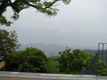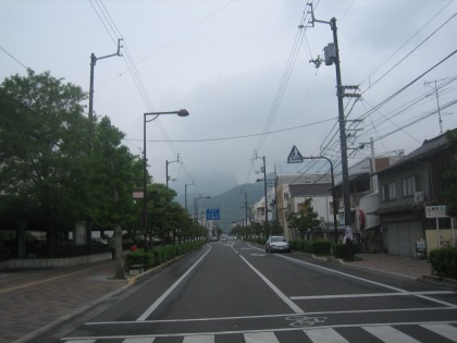 10:06 山は雨 ホテルを出発して、まずは琴平方面に向かいます。 七十五番札所に当たる善通寺の背後にある山も、雨雲に隠れ見ることができません。 山の方は雨が降っているようです。 |