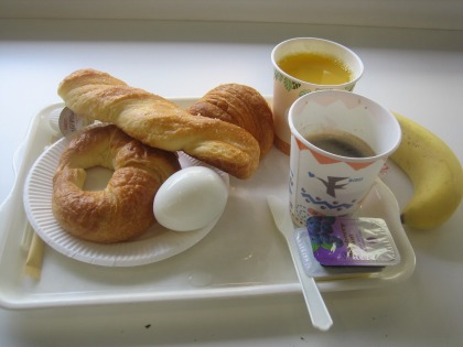 7:21 朝食 朝食はブッフェスタイル。 勝手に自分の好きなものを取って、勝手に食べる。 大したものはありませんが、これで十分。 \4,000と言う宿泊費を考えれば、立派。 東京であれば、カプセルホテルで¥3,500前後です。 (もちろん朝食なし) おにぎりとかもありましたが、このツーリング初めてのパン食。 |