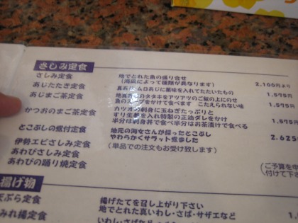 12:49 あじまご茶定食 注文は、迷っちゃいます。(@_@) いかの沖づけ定食が美味しそう。 説明を読むと、「沖で釣り上げた真イカを(生きたまま)タレを吸い込ませ(溺死させ)、のち(冷蔵庫に入れ)シャーベット状のなったもの。 ( )内は追記しました。(笑) 普段から、イカを刺身で食べる国民だから、美味しそうなイメージだけど、刺身を食べない民族からすれば、タレで溺死させるなんて、なんて残酷な!と思われるだろう。 ましてや、これがイルカだったら、”イルカの沖づけ定食”なんてあったら、「世界中で一番残酷な国民=日本人」と言われるのは間違いないね。(実際は無いけど) 結局、いかの沖づけ定食にするか迷いましたが、注文したのはあじまご茶定食。 いかの沖づけ定食はフリかい!と言われそうだが、まったくそのとおりである。^^; |