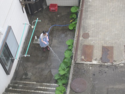 6:28 ザァーッ ザァーッ! 窓の外から聞こえてくる水の音で目が覚めました。 (@_@) 『あー雨だぁ!』 布団から飛び起きて、あわてて外を見ると、おばちゃんが水をまいていました。 (爆) 寝直します。 (-o-) 昨日、2時までワールドカップ見てたからね。 |