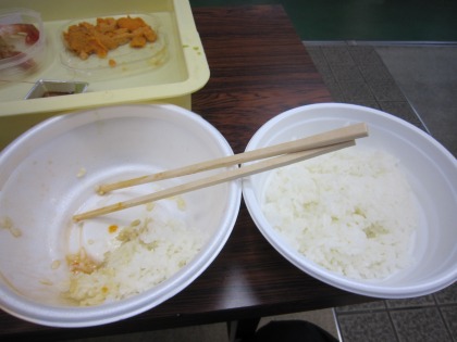 12:01 勝手丼 まずはウニ。 ウニはせっかくなので、塩水ウニ!(バフンウニ) 1パック¥1,600 そして、ボタンエビ。 一匹¥250×2匹 = ¥500。 これは、ちょっと割高ですね。 市場内の普通の魚屋さんで買えば、10匹で¥1,500くらいで買えます。でも、小分けにしてくれないので、しょうがなくちょっと割高。 その他に、塩分が足りないかなぁ〜。なんて思って、イクラ。(\300) あと、カニのみそ汁(¥100)を付けて。 \200+\1,600+\500+¥300+\100 = ¥2,700也 ちょっと贅沢しすぎだぁ。(>_<) さっそく、『いただきます』 |