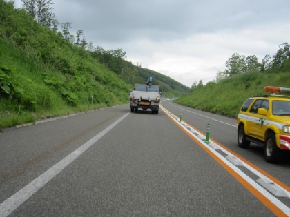 14:19 こうゆうのが困る この辺りの道東自動車道は片側一車線の対面通行です。 登り区間が少し続くと、荷物を積んだトラックの速度が落ちてきます。 制限速度80kmのところを、50kmとか60kmまで速度が落ちて走っています。 片側一車線だと抜くことができず、トラックの後ろに乗用車の行列ができてしまいます。 10kmに1箇所ぐらいの間隔で、片側二車線の区間が設定されているのですが、そこまではガマンを余儀なくされます。 |