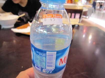 22:00 45バーツ 食事をした後、ついでに、ミネラルウォーターを購入。 500ml 45バーツ!? 45バーツですよ。45バーツ。 約120円だ! これをバンコク市内のスーパーで買えば、7バーツ(20円弱)だ。 あー驚いた。 (>_<) 搭乗開始まで、残り時間15分。 |
