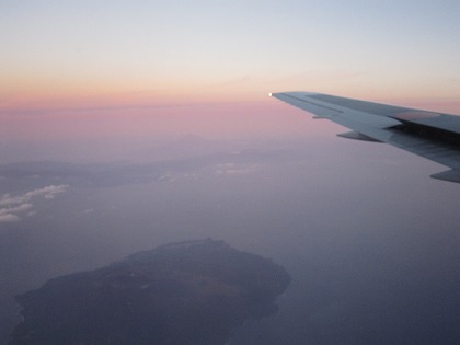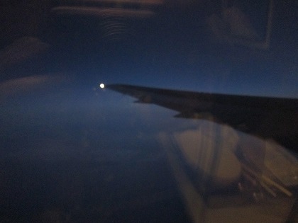 5:45 明るくなってきました チェックインの時に、嫁さんと自分のシートを隣同士にしてもらい、自分は窓側の席に。 窓際に座ることは少ないんですが、久し振り。 朝食を食べ終わる頃、窓の外が少し明るくなってきました。 ただ、眼下はまだ闇の中、海だか陸地だか区別はつきません。 |