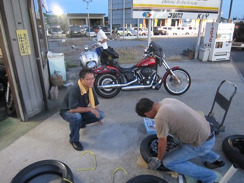 18:09 店の前で タイヤ交換は店の前で、道具広げて。 写真は男レーシングさんが写してくれました。 |