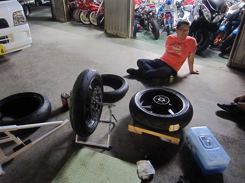 18:37 タイヤ交換終了 前後タイヤともバランスを取ってタイヤ交換は終了です。 バイクを下ろして次の作業をしようかな。と思っていたら、みんなで夕飯を食べに行こうと言うことになり、ここで作業終了。 ・他の作業は自宅でもできるしね。 (^_^;) ・今朝は4時起きだったので、眠いしね。 ・練習してきて疲れてるしね。 と、理由を付けては、めっぽう誘惑には弱い。(爆) |