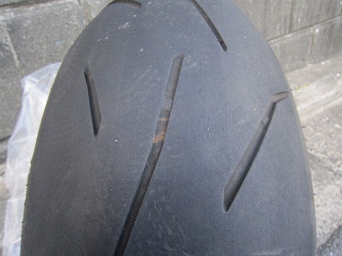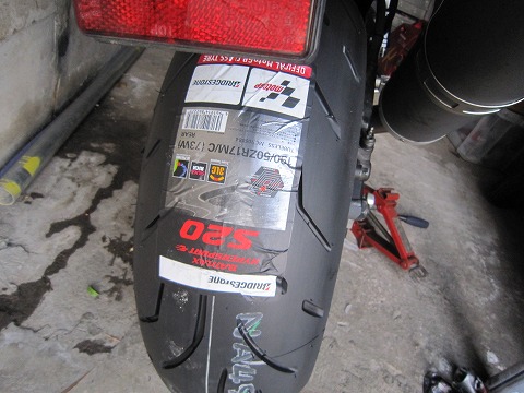 17:20 新しいタイヤは 良いタイミングで、ゴールデンウィークのセールをしていて、BSのS20を思ったより安く売っていたので、ゲット! お店のスタッフにタイヤサイズを言うと、『ピットが混んでいるので、少々お時間がかかりますよ!』 『いや、持って帰りますから!』と言ったら、 『後日、交換する場合は買ったときのレシートを持って来て下さい。』と言われました。 お店で買った場合と持込の場合と工賃が違うんですね。 『自分で換えますから!』とスタッフに告げて、お持ち帰り。(^_^)v 自宅に戻って、レーシングスタンドが出払っているので、サイドスタンドとジャッキを使って、タイヤを外して交換。 こんなときに、ちょっとした地震でもあったら、転倒間違いなしだね。(汗) |
