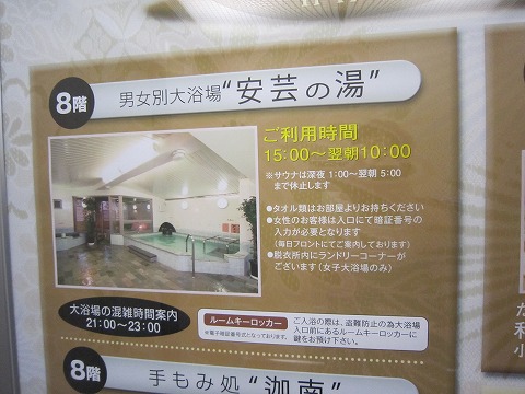18:30 部屋に 山陽・山陰ツーリングの初日は広島市内にあるドーミーイン広島に宿泊します。(宿泊費¥6,150) 駐輪場にバイクを駐めて、ホテルの部屋に戻ってきました。 駐輪場の往復時間が計算外でしたね。 今回の宿はインターネットで探して予約しました。 条件として、@ 広島市内のビジネスホテル A 朝食付き(夕食なし) B大浴場 で検索した結果、このドーミーインを選びました。 けど、駐輪場の遠さは計算外でしたね。(-_-;) @ ゴールデンウィーク中、一人旅で普通の観光旅館の予約はまず取れません。 取れたとしても、かなり割高になってしまいます。 自分の場合、夕食は外に呑みに行くこともできるので、比較的予約が取りやすいビジホを選択しました。 Aの朝食を食べる自分としては、朝食が付かないとちょっと不便。 朝から食事ができる店を探して外食と言うのも面倒。 |