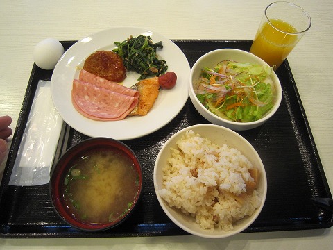 7:12 朝食です 7時になって、2階に下りて朝食。 朝食を食べるところは、もろにホテルのロビー。 パーティションとかもなく、ロビーのカウンターのすぐ脇、ちょっと落ち着きませんなぁ。 朝食はブッフェスタイル。 なので、洋食風のおかずに和食の主食なんて、変な取り合わせになってしまいました。(笑) そして、メインのご飯は旬の竹の子ご飯で、ちょっと嬉しい。(^o^) |