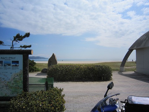 9:21 弓ヶ浜 バイクは中海に架かる江島大橋を渡り山陽・山陰ツーリングの最後の県になる鳥取県に入りました。 江島大橋からは、県道246号線経由でふたたび国道431号線に入り、美保湾に沿って南東にバイクを進めます。 途中、弓ヶ浜でちょっと休憩。 弓ヶ浜は美保湾沿いにきれいな砂浜が続いています。 海水浴に来たいような砂浜ですね。 |