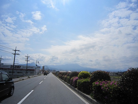 9:36 大山が見えてきました。 弓ヶ浜を後にし、引き続き国道431号線を南東に向け進みます。 目の前には、上の方に雲を被った大山(だいせん)が見えてきました。 |