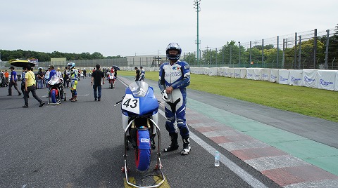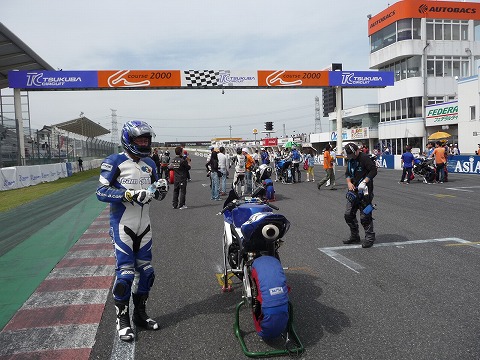 普通のレースだと、ピットロードからコースインして1周のサイティングラップを行いグリッドに着きますが、筑波TTの場合は、マシンを押してピットロードを逆走しグリッドに着きます。