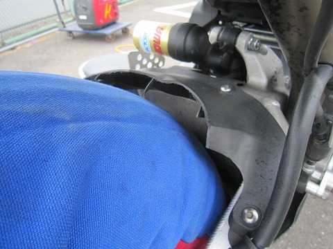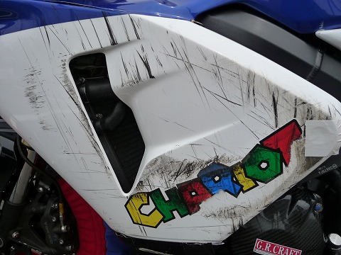 昨日の転倒で傷だらけになってしまったカウルが痛々しい。
