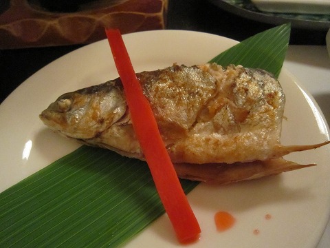 さて、テーブルに乗ったこのヒメマス、半身でちょっと寂しいが、自分のはお頭つきなのでまだ許せるとして、嫁さんのはシッポ側と寂しさ倍増。(笑)