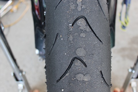 14:36 減ったタイヤ ここまで走行したタイヤ。 鈴鹿のスポーツ走行で使ったもので、リヤはかなり減っちゃって、もうすぐ溝なしになりそう。 これでも、そこそこグリップしてくれるので、ありがたいです。 対して、フロントは結構残っちゃってますね。 なので、ライフのバランスが悪いです。 ピレリだと、フロントはスーパーソフトがあるらしいんで、そっちならフロントとリヤのライフバランスがイイかもしれませんね。 このフロントタイヤはキープしておいて、街乗りのR1で使うことにします。 |