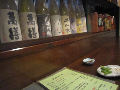 カウンターと調理場の間には、焼酎を中心にボトルがずらり。