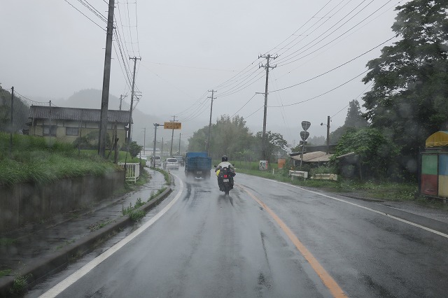 12:31 一時的な雨なら お店を出て、国道107号線と国道340号線の重複区間を分岐点を目指して東進。 「ツーリングしてますねぇ。」 ほんの一時的な雨なら、仕様がなくガマンしますが、これだけ雨が降り続くと、自分なら耐えられないなぁ。 しかも、しっかり降っていて、先の山並みが雨で煙っていますし。 |