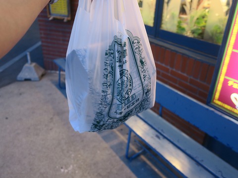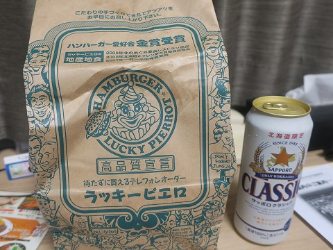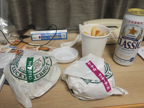 19:00 買ってきたのは 買ってきたのは、ラッキーピエロの代名詞とも言えるチャイニーズ チキン バーガー、それにスタンダードのハンバーガーで”ラッキー チーズ”、付け合わせにフライドポテトの”ラキポテ”。 持って帰ってきたペーパーバックがガッツリ重い。 モスバーガーの1.5倍くらいの重さがありそう。 それでは、「いただきます。」 |