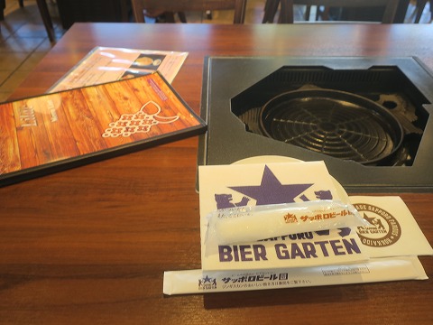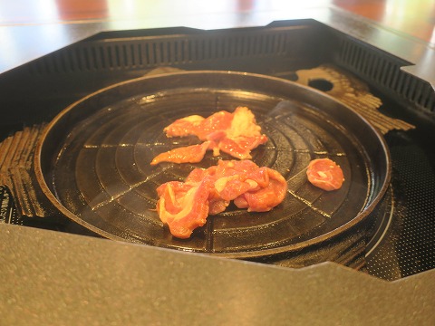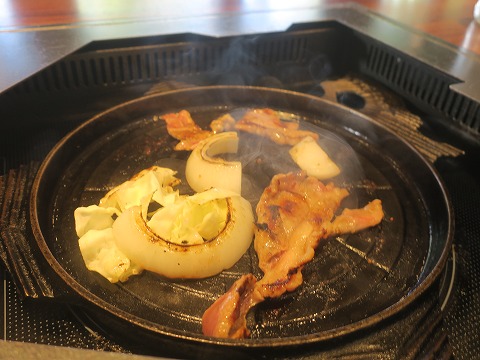 16:26 平らな鍋 店内に案内されて、4人がけのテーブルへ。 ジンギスカンの鉄板? 鍋? は一般的にみられる鉄兜型のものではなく、中央がちょっとだけ盛り上がっていて、ほぼ平面。 平らなワケは、電磁調理器だから。 電磁調理器の熱量に不満があるわけじゃないんだけど。 でも、やっぱりガスの火で兜型の鍋がいいよなぁ~。 豪快に煙を上げながら。 |