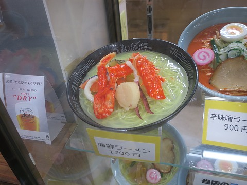 12:33 外も向けのは ショーケースには、カニ、エビ、ホタテ、イカにシャケをトッピングした海鮮ラーメンなるものが。 (O_O) でも、頼まない。 お値段1,700円と、ラーメンとしてはかなりお高い。 からじゃなくて、どう見ても外の人向けだもんね。 ここは、やっぱり中の人向けの普通のを頼まないと。 |