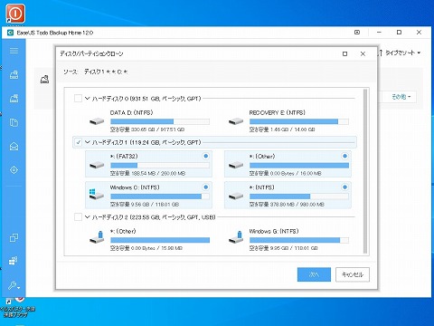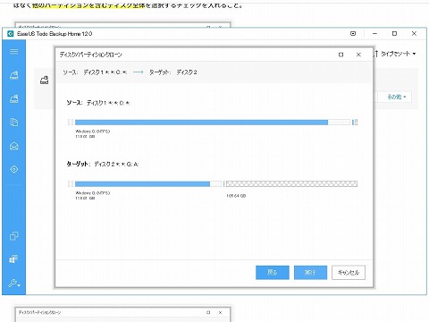 クローニング先の選択 クローニングは、ソース(コピー元)をCドライブを選択。 ターゲット(コピー先)にGドライブを選択。 そして、クローニング実行。 |