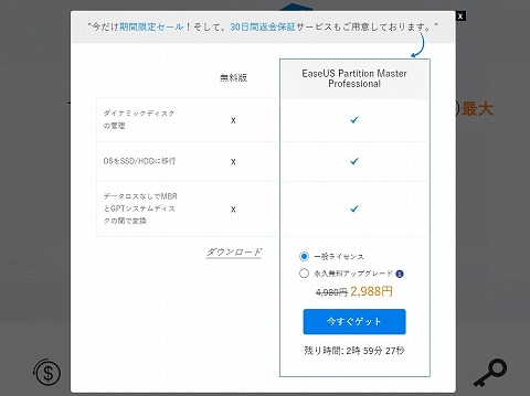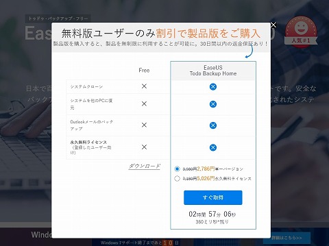 割引で? 無料版をインストールすると、”割引”で製品版を購入できる案内が標示されます。 (なんとなく誘導されている感がひしひしと感じられますが・・・。) やっぱり”システムクローン”を作成するには、有料版じゃなかダメみたいで。 今回はムダな抵抗は止めて、お金を払って製品版を購入します。 (これで上手くいかなかったら、泣きますよ。(笑)) |