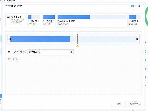 パーティション サイズを変更 パーティションのサイズを最大を割り当てます。 けど、よく分かりませんが上手く行きませんでした。 ただ、最大じゃなければパーティションサイズを変更出来たので、10GBくらい残して、210GBを割り当て。 |