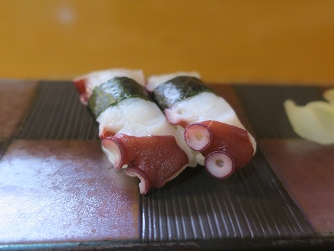 20:12 タコで〆る タコ。 ケースの中にどーんと足が1本。 美味しそうだったので、握ってもらいました。 塩味の中に、ほんのりとした旨味があって、美味しいですね。 もっと食べようかと思っていたけど、思いのほかお腹が膨れたので、今宵はこの辺で止めておきましょう。 |