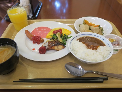 7:54 朝食 「取ってきたよ。」 ブッフェだけど、ちょっと控えめ。 否、かなり控えめ。(笑) 写真で分かる、昨晩のダメージ度。(笑) 元が取れませんぜ。 せっかくのブッフェなのにね。 |