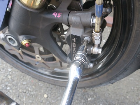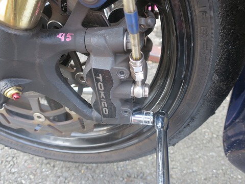 17:15 確実に 最後にブレーキキャリパーの取付け。 キャリパーを取り付けているボルトはCBRは二面幅14mmで、GSX-Rより大きいんだけど、それでもトルクは普通の締付けと比べると高め。 なので、適正に取付ける様、締付けトルクはトルクレンチの数字任せ。 |