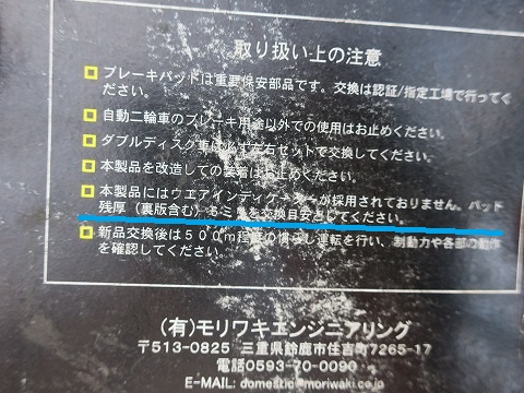 16:32 使用限度は で、このモリワキのブレーキパッドですが、取説に書いてあるとおりウエアインディケータがありません。 パッドに溝が切ってあるヤツね。 なので、パッと見、使用限界がわからない。 これが唯一、不便なところ。 そして、推奨の使用限度は、残厚6mm。 |