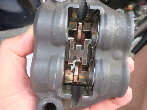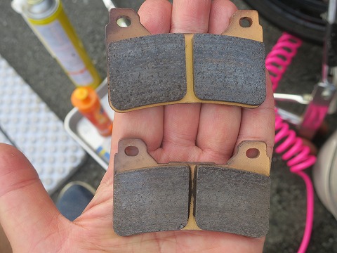 16:31 モリワキの そして、キャリパーを外したら、ブレーキパッドの残厚の確認。 今装着しているパッドはモリワキ製。 効きは純正と比べて遜色なくて、持ちが良い。 そして、値段もリーズナブルで、言うことなし! だったんだけど、販売中止になっちゃった。 残念。 とっても残念。 HRCのパッドは財布に優しくないのだよ。 ぼくのために再販してくれないかなぁ。 |