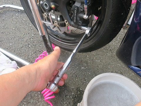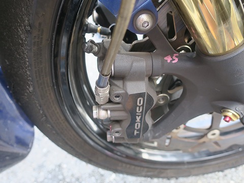 16:27 左側から それでは、左側から。 ブレーキ キャリパーを取り外します。 ピンク色のペイントマーカで書いてある数字は、キャリパーの締付トルク。 サーキット用なので、間違えないように直接書いちゃう。 サーキットにいって、ボルト締めるのに、いちいちサービスマニュアルでトルクを調べてたらカッコ悪いでしょ。 見栄を張っているわけです。(笑) ※ サーキットだからって、サービスマニュアルを見て作業することは、カッコ悪いことではありません。 正しく、整備しましょう。 整備不良で、トラブルを起こすことの方が、カッコ悪いです。 |