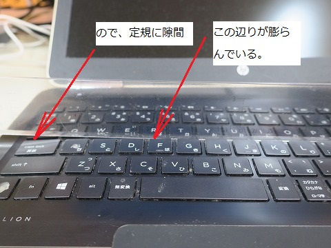 取っちゃった。 キーを引っぺがして取っちゃった。 中にはホコリがたっぷり。 無理矢理外したので、キーが元に戻らなくなっちゃいました。(汗) まあ、とりあえず上に載せた状態で使ってます。(笑) キーの修理が出来るかネットで”hp pavilion 15-au100 キーボード修理”で検索してみたけど、キー1個だけの修理は出来ないみたいで、キーボード全部交換になるらしい。 で、同時に検索結果で出てくるのが、「内蔵バッテリーが膨張して、キーボードが盛り上がる。」っていう案件。 |