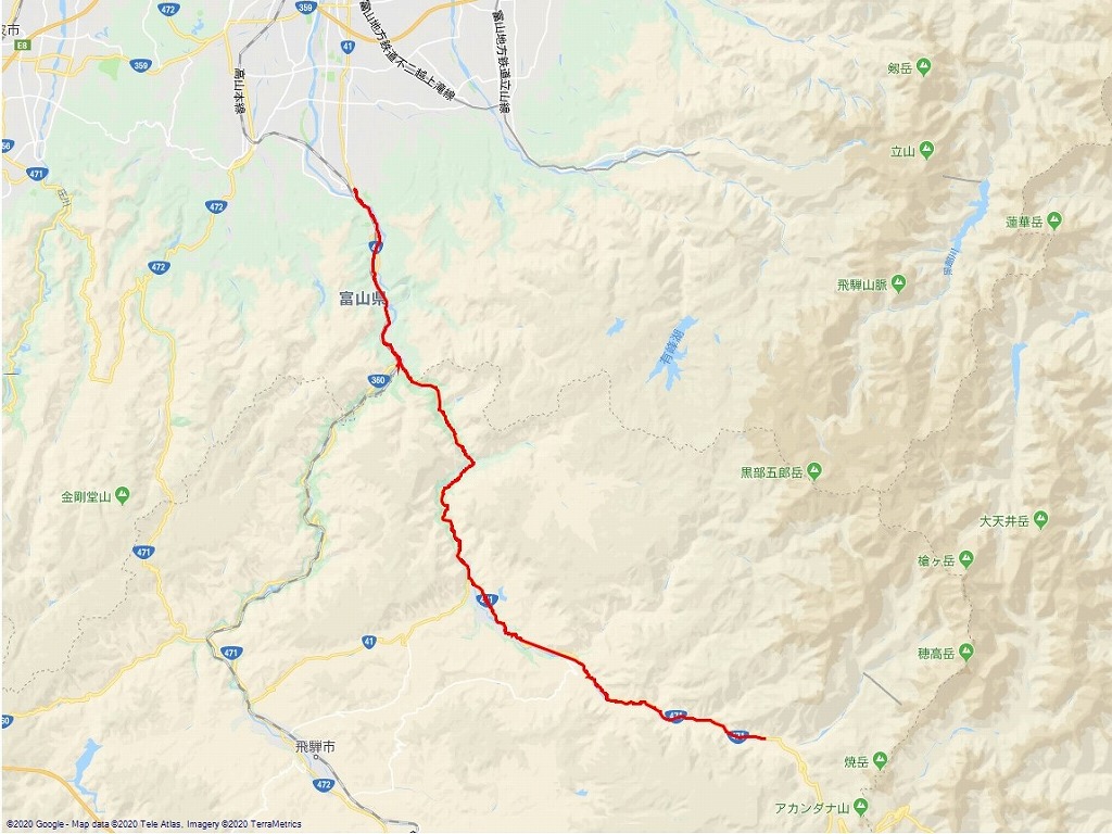 | 途中の道程: 社宅 → 中央道 → 松本IC → 安房トンネル → 栃尾温泉(ここまで電源入忘れ) → 神岡 → 富山市 | |