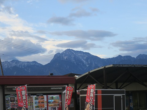7:49 着雪 八ヶ岳PAの駐車場から南アルプスを見ると、北側の谷の部分には着雪していますね。 険しい。 |