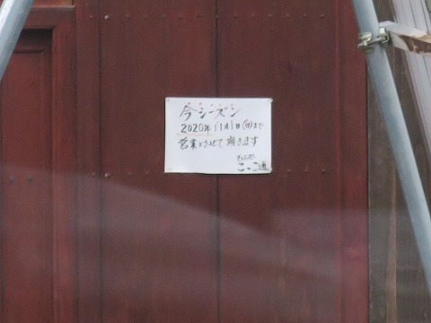 11:07 11時オープンの さらに国道41号線を北上し、国道360号線との交差点から国道360号線に入り、宮川方面に1kmほどクルマを走らせ、急遽ネットで探した蕎麦屋さん”こっこ通(こっこつう)”に到着しました。 ネットの情報だと、11時オープン。 のはず、ですが・・・・・。 入口、閉まってますねぇ。 新型コロナウィルス感染症の影響で、オープンの時間が遅くしているのかな。 |