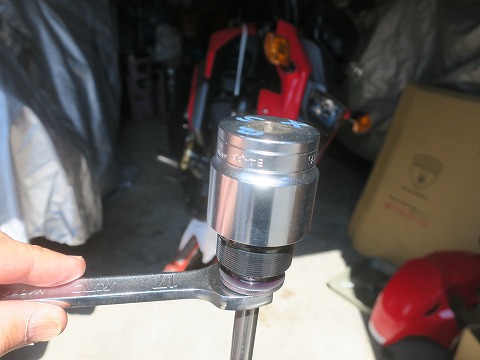 11:13 一番下で もう一本のフロント フォークはバラす前だったので、ロックナットの位置を確認。 ロック ナットがネジを切ったてある一番下の位置のちょっと手前で止まってます。 たぶん、ネジ山が5oくらい余るぐらいで、ナットをロックするのが標準の位置じゃないかな? このロックナットの位置で、フォークのスタッティックな状態での長さが決まってくるので、これだと前下がりになっちゃいます。 このフォーク、一度バラシてますね。 たぶん。 それで、セッティングを変更したか、マニュアルを見ずに一番奥までナットを回してから、ボルトを取り付けたかしてますね。 ユーズドの車両だと、こうゆうことは得てして”あるある”ですね。 |